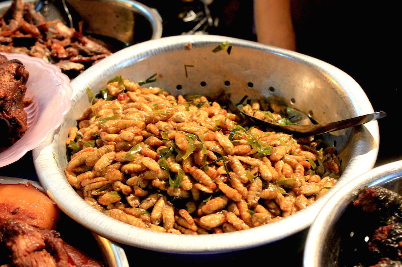 The next stall over featured a pan of freshly fried silk worm larvae that were reminiscent of the insects I had eaten while in Chiang Mai. Maybe not the best food in the world, but surprisingly, this looked appetizing after having just eaten worms. I popped a couple into my mouth and got a oily burst of flavor.