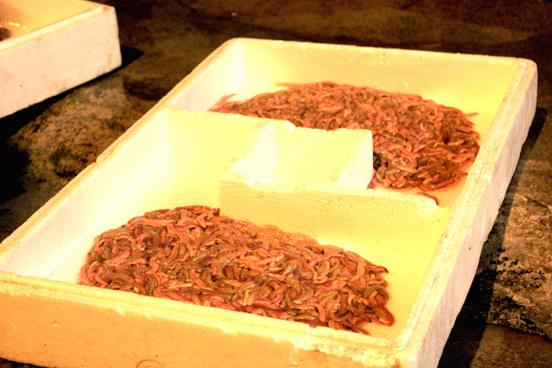 Another section down a narrow street seemed to be for the more adventurous eaters. An elderly woman had set up a propane, one burner stove to sell her fresh ragworm cakes, the live ingredients squiggling right next to the frying pan. The patties, about the size of a McDonalds hamburger, are a combination of worms, mandarin peel, dill and the chefs choice of spices. For just a dollar, the owner fried them up fresh.