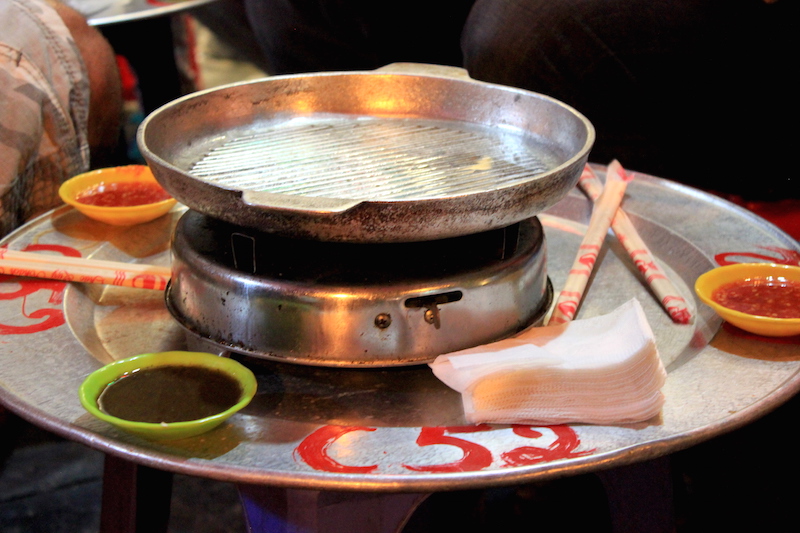 We ordered frog legs, pork belly, duck tongue and beef, then took a seat at one of the tiny tables with a steel top. There was a heating pan in the center that would be used to keep our future food warm.