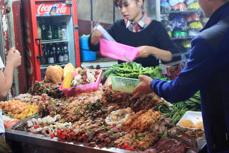 For the Hanoi street food main course we stopped at a well known Vietnamese grill, Thai Dat. The center of the shop featured a table with a dozen varieties of skewers and to the right of the raw food, a flaming grill ready for action.