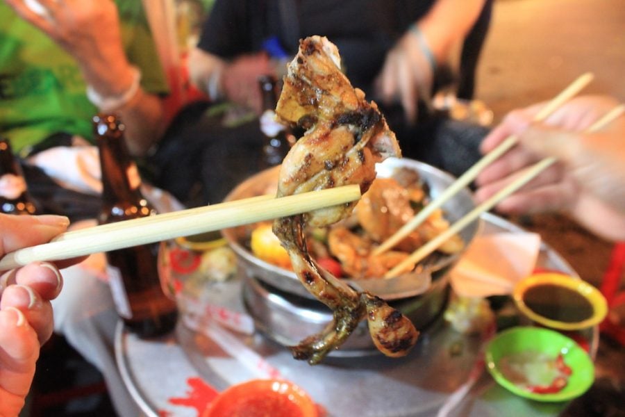 The streets of Hanoi are lined with small cart vendors who set out their miniature red and blue plastic chairs along the sidewalks. In the mornings the customers are drinking the shops Vietnamese coffee or green tea with a bowl of Phở and in the afternoon they could be eating anything from a Banh Pate sandwich to barbecued frog legs to ragworm cakes.
