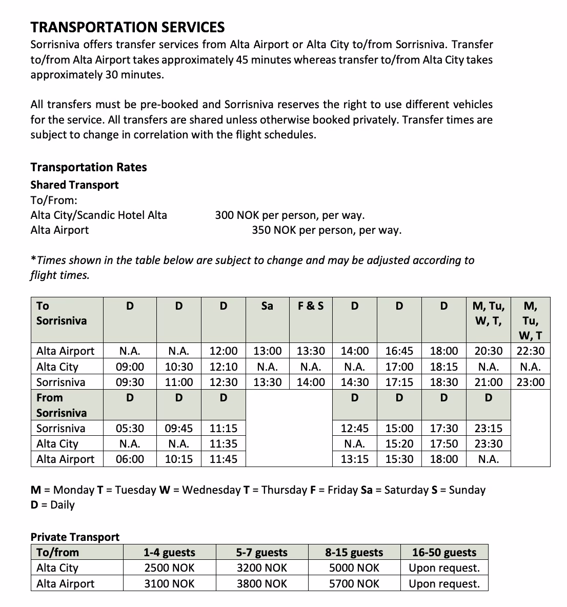 Getting To Sorrisniva from Alta: From the airport or the Alta city center, you can take a taxi to reach your destination, though it will run you around $100. Sorrisniva also offers transportation for its overnight visitors a few times per day (you can see the schedule here), just make sure to book it ahead of time!
