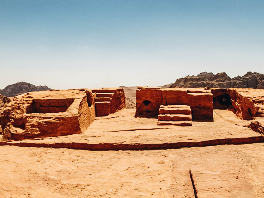 The altar area features a wide rectangular triclinium. A big stone block in the center of the High Place is preceded by three stairs. The circular altar lies next to it, accessible by three more steps; surrounding stone water troughs were used for cleansing and purification.