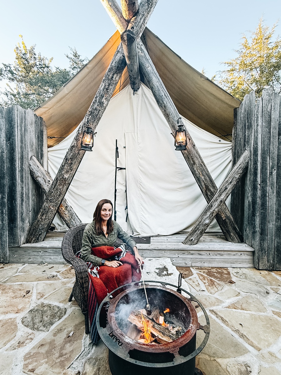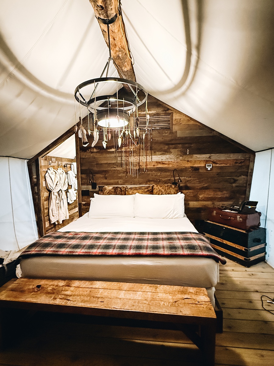 I can confirm that this is not your average camping experience! Once you step through the canvas door you’ll find hardwood floors, a beautiful chandelier, a king-size bed, and functioning air conditioning and heat. Call it five-star rustic, if you will.
