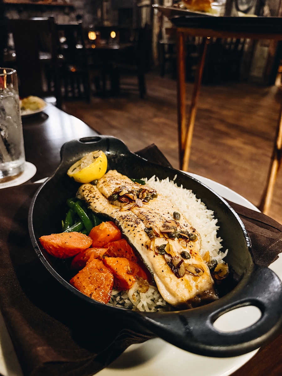 The menu showcases elevated Southern comfort food. I started with the Spinach Artichoke Dip, wonderfully rich and cheesy, served with warm baked pita bread. For my entrée, I chose the Rockbridge Rainbow Trout with basmati rice, sliced almonds, green beans, baby carrots, and a delicate brown butter caper sauce that complemented the fish perfectly.