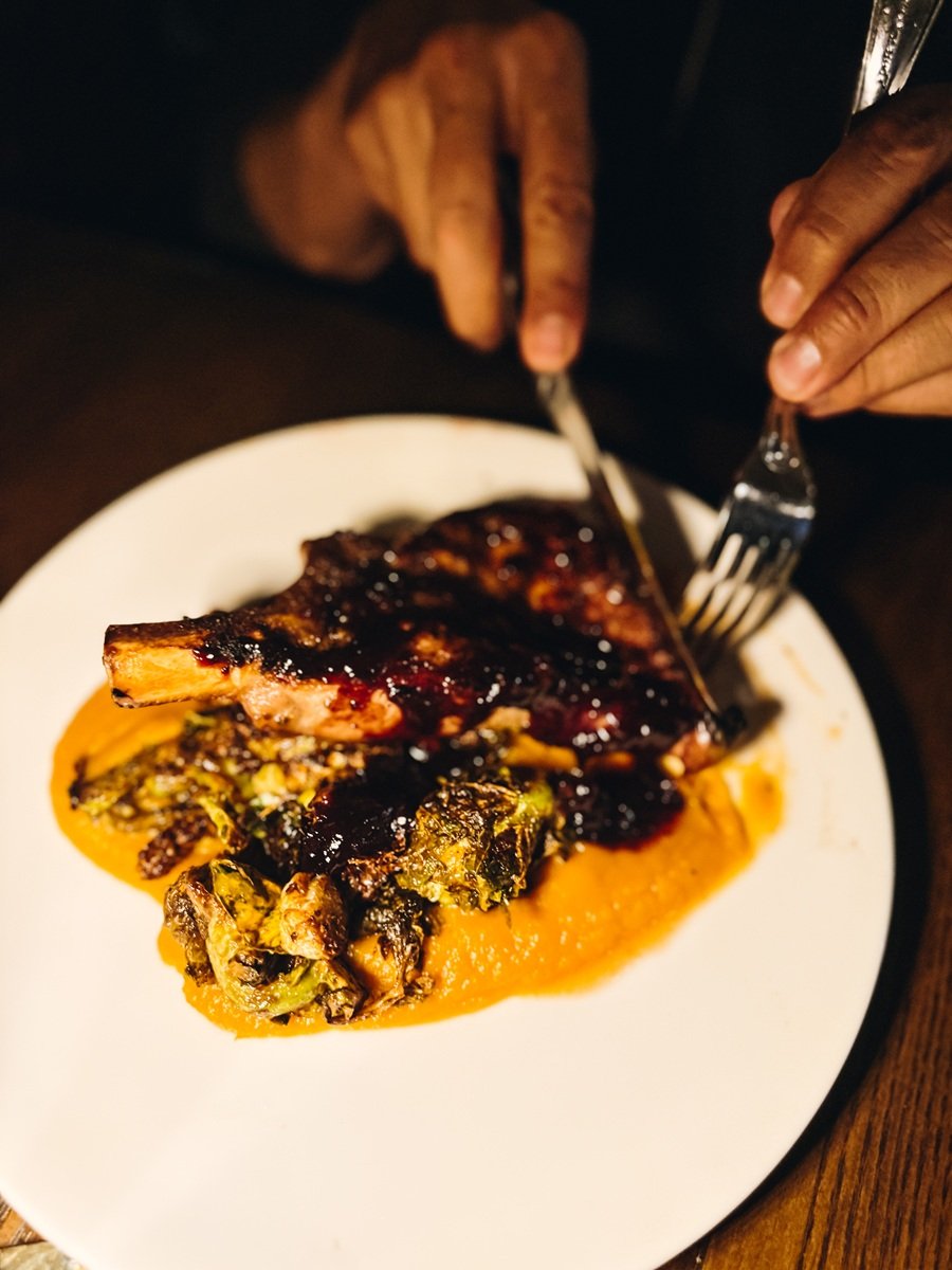 The standout for me was the tuna tataki, plated with Moroccan spices, cucumber, and cantaloupe. But honestly, everything we ordered delivered: beet-pickled deviled eggs, a baby iceberg wedge with crispy pork rinds, a perfectly pan-roasted halibut with rock shrimp fritters, and a smoked pork chop dressed up with blueberry-chipotle BBQ sauce.