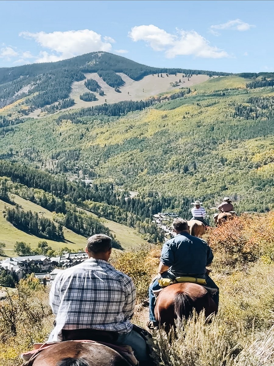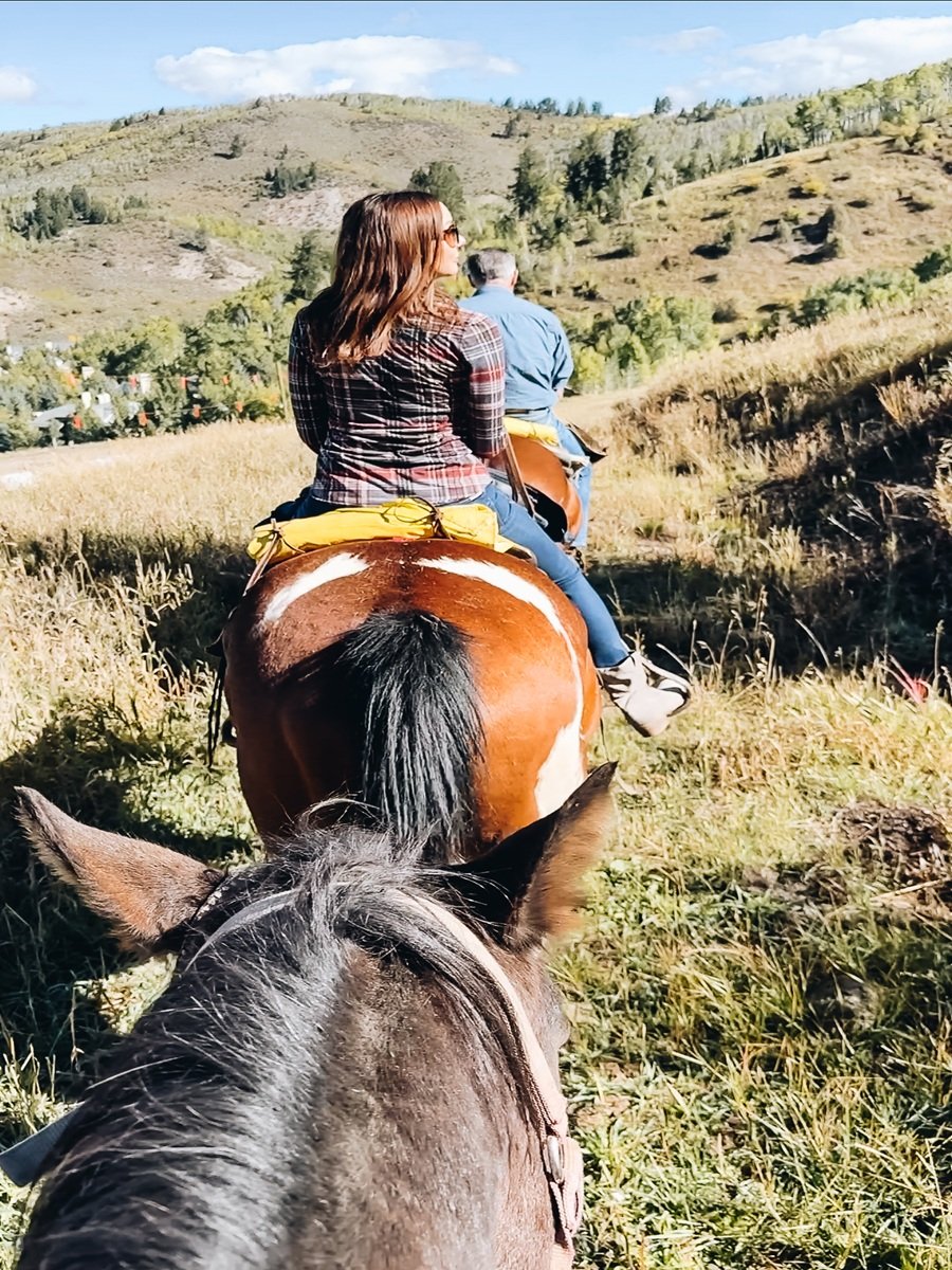 Next up: a horseback ride with Beaver Creek Stables—my favorite experience of the trip. I rode JR, a steady and patient horse, while Pete had Geronimo, who came with a little extra personality. The ride up Beaver Creek Mountain takes about an hour, winding single-file through aspen groves and open trails, then opens up to stunning alpine views. At the top, we enjoyed a picnic lunch with the mountains as our backdrop before riding back down.