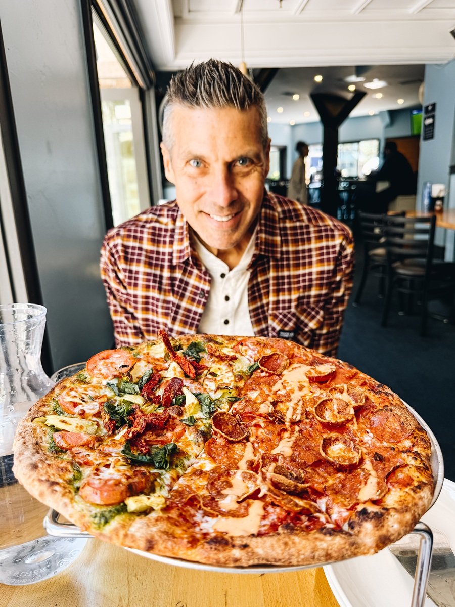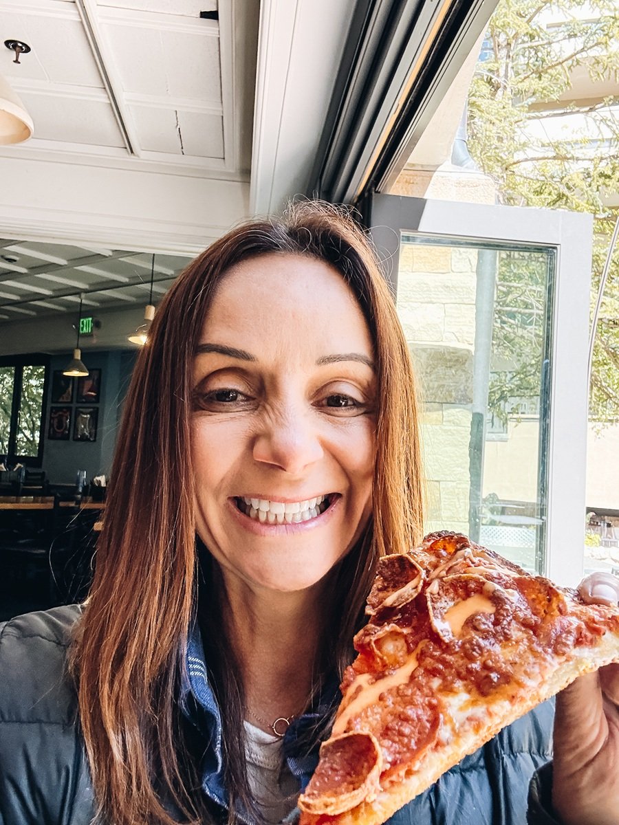 We split a half-and-half pizza: one side Super Pepperoni (three types of pepperoni and a spicy ranch drizzle), the other Spring Pizza (artichoke hearts, sundried tomatoes, fresh basil, pesto). Add in a summer salad of arugula, fruit, pecans, and gorgonzola, and you’ve got yourself the ultimate post-adventure lunch.