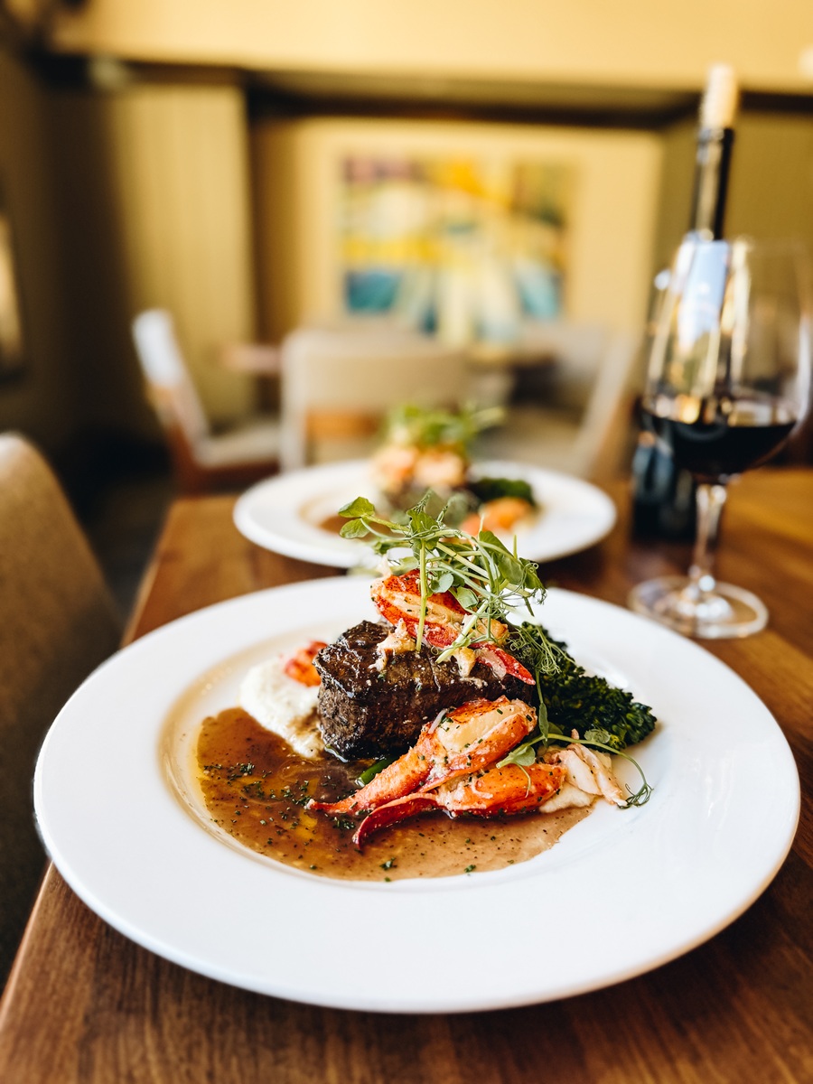 Next up was a grilled red beet saled with baby arugula, goat cheese mousse, crisped onions, and bacon vinaigrette, followed by the show-stopping pan-seared 8oz tenderloin with green chili grits, roasted broccolini and brown butter lobster.