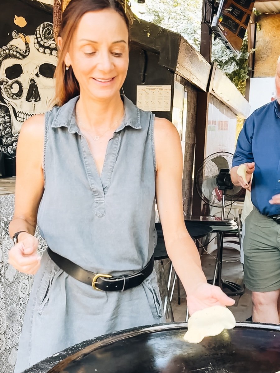 Calling it a “cooking class” is generous. It’s really an eating class with occasional participation (which, honestly, was fine by me). We wandered through their garden to see the marigolds, agave, moringa and mango trees before settling in with a Wildflower cocktail made with mezcal, hibiscus, cinnamon, clove, and piloncillo.