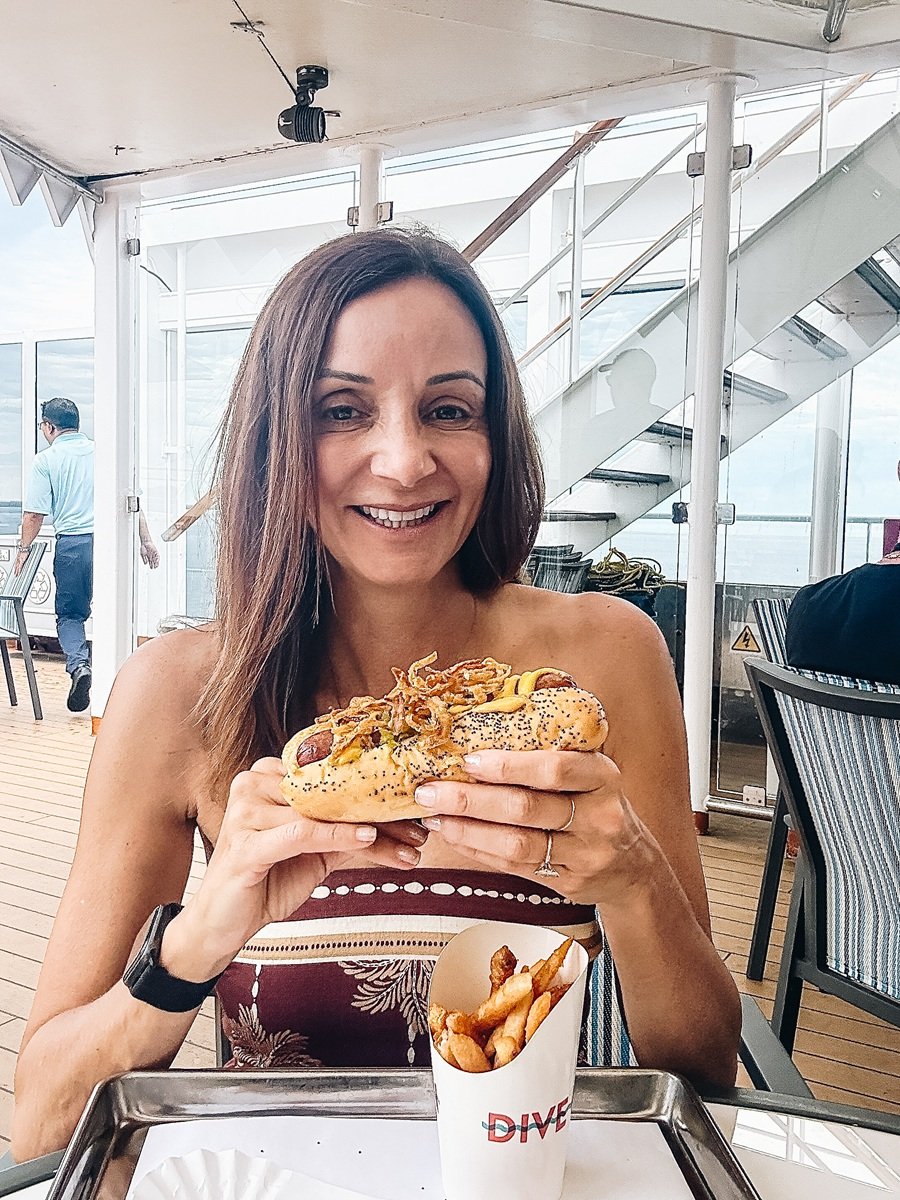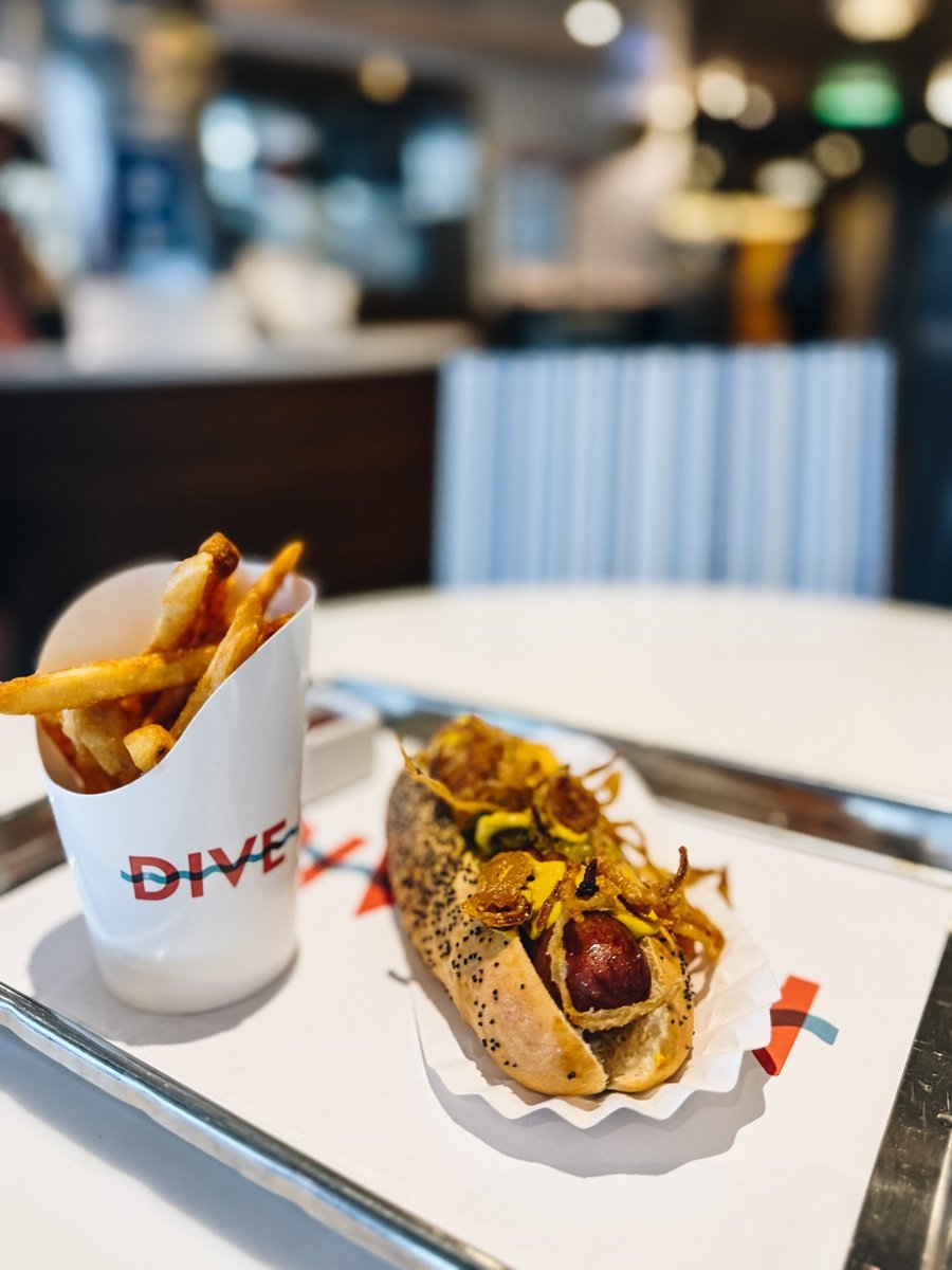 Dive-In is a casual poolside place where you can enjoy a burger that is grilled to perfection and served on a toasted brioche with our own trade-marked secret sauce. Or choose a grilled chicken breast sandwich. But, my lunch ritual was having the Dive-In Dog loaded with mustard, relish, and a mountain of frizzled onions. And of course a side of crispy fries.