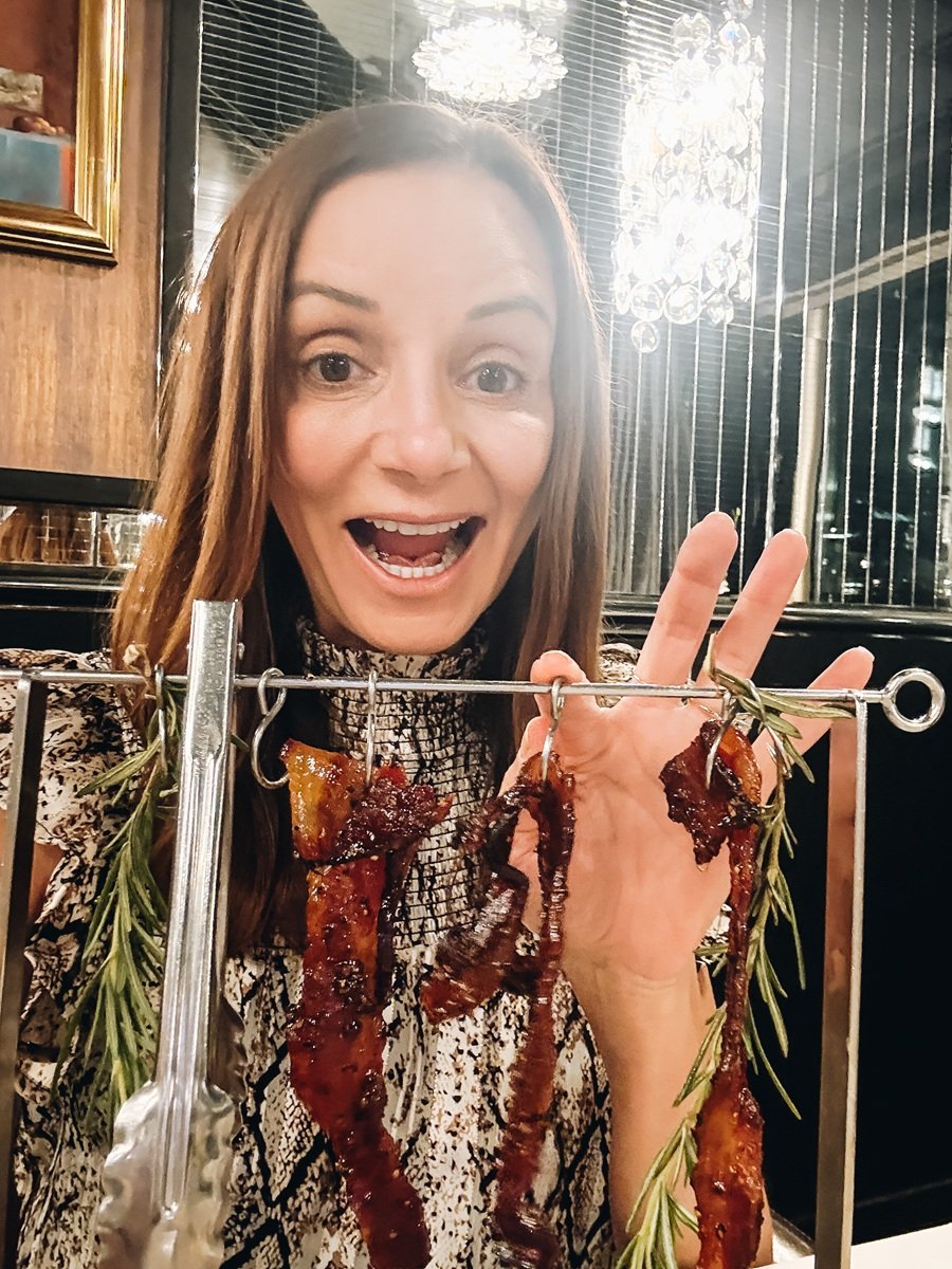 My filet mignon was one of the best I’ve had anywhere, land or sea. The grilled lamb chops with controne bean purée and garlic chips were equally impressive. But, the one thing you can’t skip is the clothesline candied bacon created by chef David Burke.Delish!